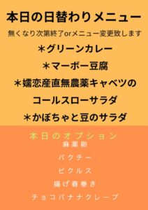 日本橋人形町サロンゴカフェ日替わりランチ・グリーンカレー、麻婆豆腐、嬬恋産キャベツのコールスローサラダ、かぼちゃと豆のサラダ、揚げ春巻き、クレープ他