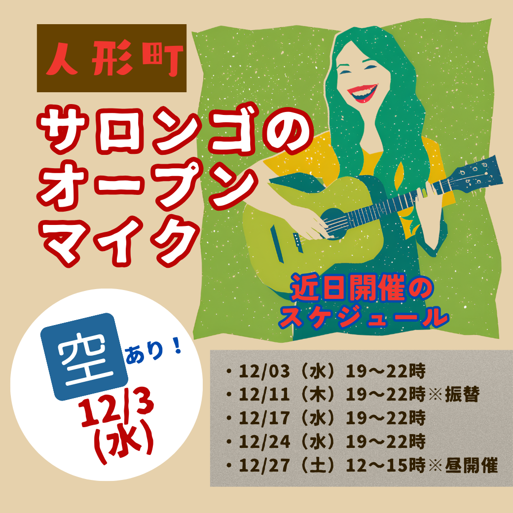 ①素人ミュージシャン集まれ!サロンゴカフェのオープンマイクは、素人の皆さんに歌や演奏を楽しんで頂くイベントです。 腕自慢の方はもちろん! ブランクミュージシャン、 楽器を始めたばかり方も大歓迎です。