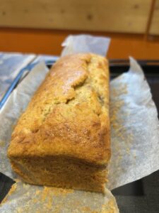 170℃で40分ほどじっくり焼きました。バナナの甘みと小麦の旨味が引き出せているといいです。カットして販売致します~~皆さまのお越しをお待ちしております♬