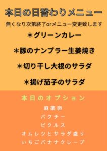 日本橋人形町サロンゴカフェ日替わりランチ・グリーンカレー、豚のナンプラー生姜焼き、切り干し大根のサラダ、揚げ茄子のサラダ、オムレツ、クレープ他