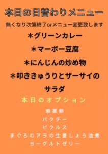 日本橋人形町サロンゴカフェ日替わりランチ・グリーンカレー、マーボー豆腐、にんじんの炒め物、たたきキュウリのサラダ、まぐろのアラの生姜しょう油煮、ヨーグルトゼリー他
