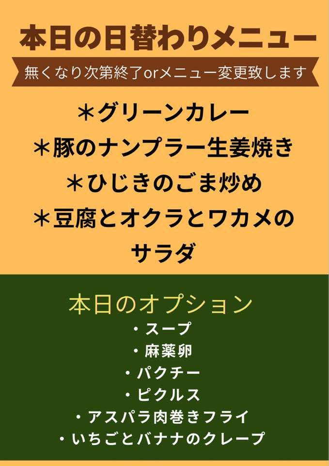 日本橋人形町サロンゴカフェ日替わりランチ・グリーンカレー、豚のナンプラー生姜焼き、ひじきのゴマ炒め、豆腐とオクラとワカメのサラダ、アスパラ肉巻きフライ、クレープ他